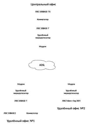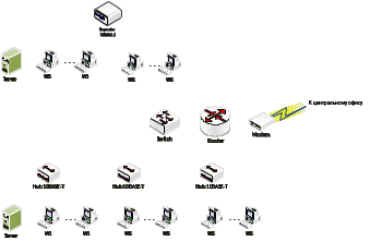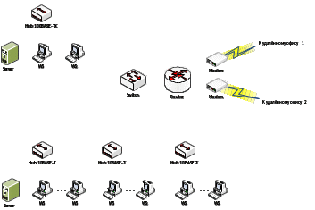 В центральном офисе фирмы расположены ЛВС 100 Base TX , содержащая один концентратор, и ЛВС 10 Base T, содержащая три концентратора. Обе сети подключены к коммутатору, к нему также подключен удаленный маршрутизатор с двумя модемами.