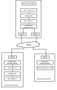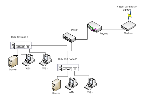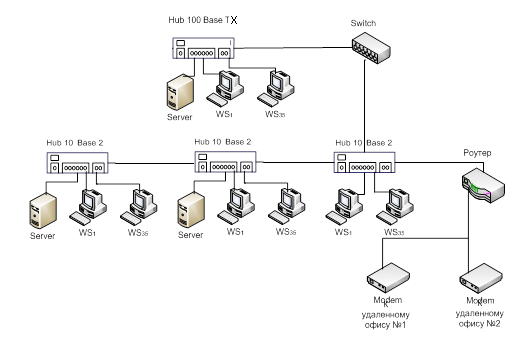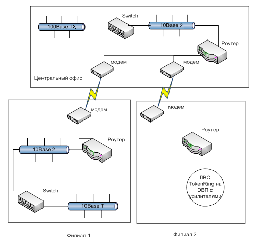 Разработана объединённая сеть фирмы для центрального офиса и двух удалённых филиалов. В центральном офисе фирмы расположены ЛВС 100 Base TX и ЛВС 10 Base 2