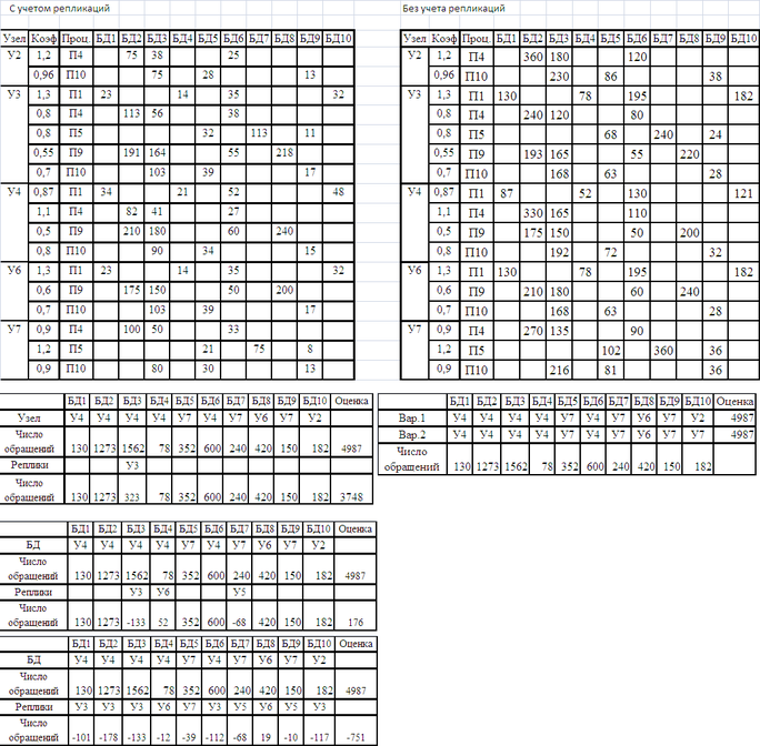 6. Выполнено распределение предметных баз данных по узлам сети (без учета репликаций и с учетом репликаций).
