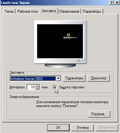 Перейдя на вкладку "Заставка" следует снять галочку с пункта "Защита паролем", если не хотим каждый раз после нескольких минут неактивности вводить этот самый пароль заново.