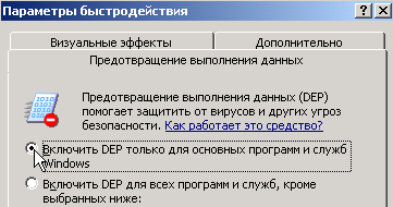 Перейдём на вкладку "Предотвращение выполнения данных". Если вы испытываете проблемы при работе приложений, вызывающие сообщения "Память не может быть read", выберите пункт "Включить DEP только для основных программ и служб Windows"