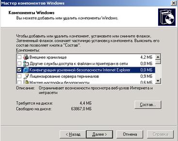 Нажав кнопку "Установка компонентов Windows" получим окно выбора компонентов. Снимите галочку с пункта "Конфигурация усиленной безопасности Internet Explorer "