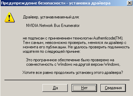 Теперь можно поставить драйверы устройств. Следует учесть, что не все оборудование официально поддерживает серверные системы, поэтому если в процессе установки драйверов встретите сообщение, которое показано на рис. 30, просто нажмите кнопку "Да". Как правило, проблем после этого не возникает.