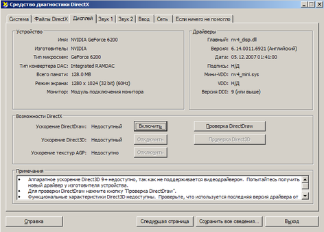 В завершение нужно включить DirectX ускорение. Наберите в диалоге "Выполнить" dxdiag, после чего откроется "Средство диагностики DirectX", в котором нужно перейти на вкладку "Дисплей"