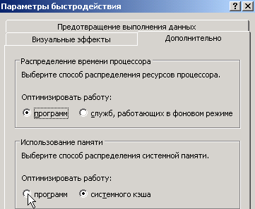 В разделе "Распределение времени процессора" выбор должен быть сделан в пользу программ. Для раздела "Использование памяти" не всё так однозначно. Системам с небольшим количеством оперативной памяти показано оптимизировать работу программ. Если же памяти 512 Мб и более, возможно стоит оптимизировать работу системного кэша. В этом случае переключение между приложениями будет более быстрым.