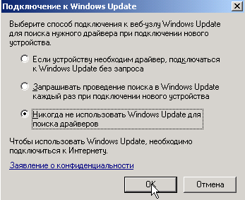 Выберите "Никогда не использовать Windows Update для поиска драйверов" и нажмите OK.
