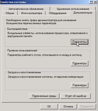 Дальше перейдём в диалоге "Свойства системы" на вкладку "Дополнительно" и займёмся настройкой разумного соотношения удобства и быстродействия.