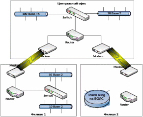 В первом филиале фирмы расположены ЛВС 10 Base-2, содержащая три концентратора, и ЛВС 10 Base-2, содержащая три сегмента. Обе сети подключены к коммутатору, к нему также подключен удаленный маршрутизатор с одним модемом.