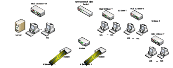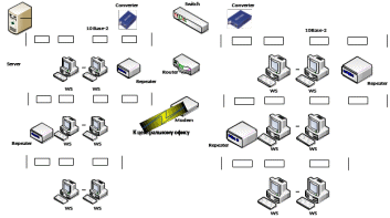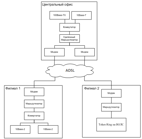 Согласно техническому заданию, в центральном офисе фирмы расположены ЛВС 100 Base TX , содержащая один концентратор, и ЛВС 10 Base-Т, содержащая три сегмента. Обе сети подключены к коммутатору, к нему также подключен удаленный маршрутизатор с двумя модемами.