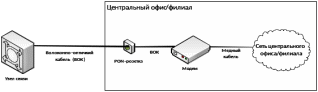В нашем случае оптический кабель будет доходить до офиса и филиалов, в которых размещены PON-розетки, к которым в свою очередь будет подключаться модем для дальнейшей передачи данных в сеть, определенную техническим заданием. Упрощенная схема представлена на рисунке 10.