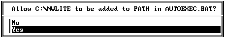 Программа установки спросит у вас разрешение добавить созданный каталог C:\NWLITE в путь, указанный в переменной PATH в файле autoexec.bat (рис. 4.6). Разрешите ей сделать это, выбрав в предложенном меню строку "Yes".