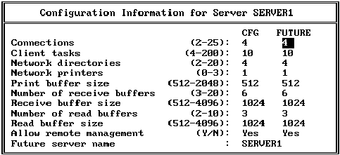 Выберите в меню "Supervise the Network" строку "Server configuration". Появится меню серверов NetWare. Выберите нужный вам сервер. Появится диалоговая панель "ConfigurationInformationforServer ...", где вместо многоточия будет находиться имя сервера (рис. 4.9).