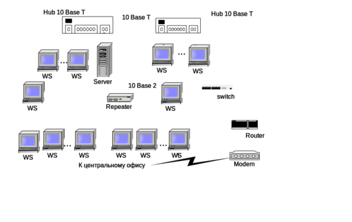 В центральном офисе фирмы расположены ЛВС 100 Base TX , содержащая один концентратор, и ЛВС 10 Base T, содержащая 3 сегмента. Обе сети подключены к коммутатору, к нему также подключен удаленный маршрутизатор с двумя модемами.