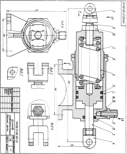 Пневматический цилиндр состоит из корпуса поз.1,в который ввинчен цилиндр поз. 2.Для предотвращения самоотвинчивания предусмотрена гайка поз. 8. Воздух под давлением подается через штуцер поз. 6 и используется для перемещения поршня поз. 3 только в одном направлении — влево. Вправо поршень возвращает пружина. Использованный воздух выходит в атмосферу через тот же штуцер поз. 6.
