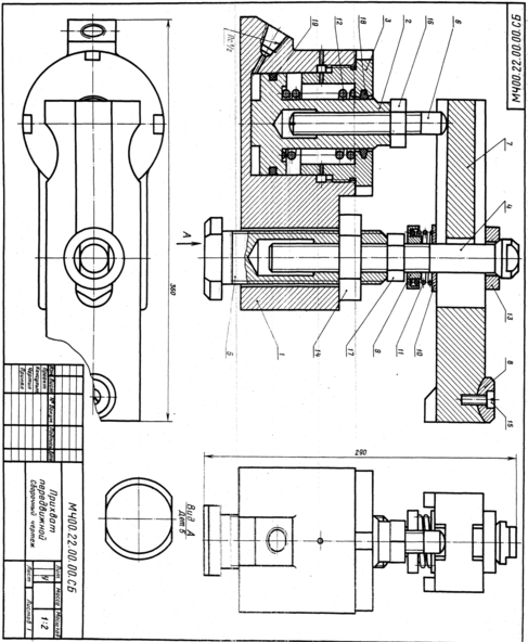 Тиски данной конструкции служат для закрепления обрабатываемых деталей на металлорежущих станках. Тиски устанавливаются на столе строгального или фрезерного станка и закрепляются шестью болтами (на чертеже не показаны). Обрабатываемую деталь закладывают между двумя пластинами поз. 6. Винт поз. 5, имеющий прямоугольную резьбу, удерживается от осевого перемещения кольцом поз. 7 и штифтом поз. 12. Чтобы втулка поз. 4 не вращалась вокруг своей оси, установлен винт поз. 8. При вращении винта поз. 5 подвижная губка поз.2 будет перемещаться по направляющему пазу корпуса поз. 1, зажимая пластинками обрабатываемую деталь.