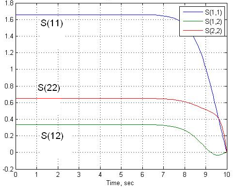 Разработав специальный скрипт, который выполняет численное интегрирование системы уравнений Рекатти и выводит результат в качестве графиков, я получил наглядное решение системы, что как мне кажется лучше для качественного понимания работы системы.