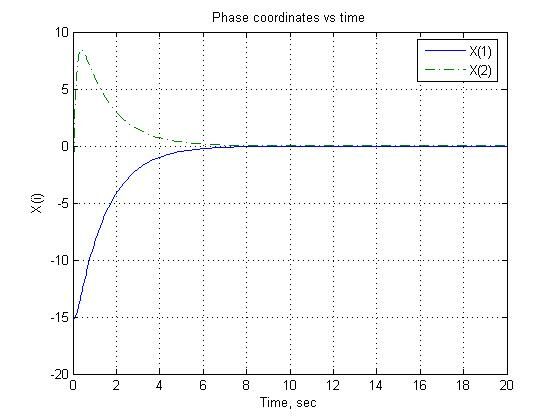 Рис. 2. График зависимости фазовых координат системы от времени (реакция системы на полученное оптимальное управление).