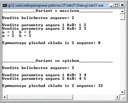 printf("\nSymmarnaya ploshad sklada is %d angarov: %d\n\n\n\n\n",n,sq);