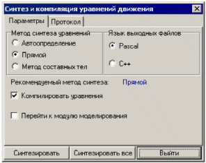 В этом окне на закладке Параметры необходимо выбрать метод синтеза уравнений (рекомендуется выбрать прямой метод) и язык выходных файлов (необходимо выбрать тот язык, компилятор которого установлен на вашем ПК). Далее следует установить флажок Компилировать уравнения и нажать кнопку Синтезировать, а затем – кнопку Выйти.