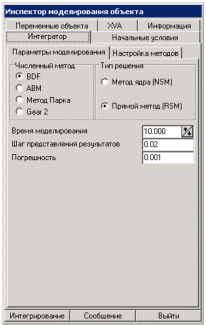 Для задания параметров моделирования необходимо перейти на закладку Интегратор Инспектора моделирования объекта (см. рис. 1.17). Здесь необходимо задать: