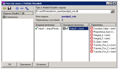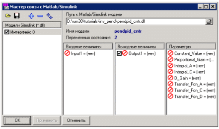 Мастер связи загрузит указанную модель и установит число входных и выходных величин модели системы управления, а также число параметров этой модели и переменных состояний, см. рис. 1.27.