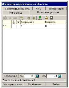 Для задания начальных условий движения системы необходимо перейти на закладку Начальные условия Инспектора моделирования объекта. Появится список всех координат системы. В полях Координата и Скорость нужно указать значения начальных условий и нажать клавишу Enter, рис. 1.18.