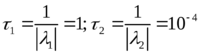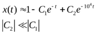 Решение практически определяется составляющей e-t, другая составляющая мала и быстро затухает. Несмотря на это, при интегрировании явным методом шаг следует выбирать порядка 10-4;