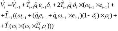 Соотношение (11) позволяет определить динамические составляющие сил и моментов отдельных звеньев с заданными геометрическими и инерционными характеристиками при действии на них внешних сил и моментов. Оно также является рекуррентным, так как силы и моменты реакции, действующие со стороны «i+1» звена равны по модулю, но противоположны по знаку силам и моментам, действующим со стороны «i»-го звена на «i+1». Таким образом, при известных законах движения стойки