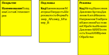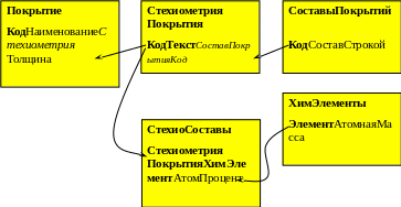 Покрытие(Код,Наименование,Стехиометрия,Толщина)