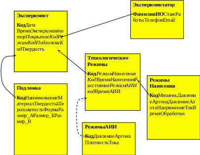 Назначение: Использование БД для накопления и долговременного хранения данных экспериментов, в ходе которых осуществляется нанесение однослойных вакуумных покрытий различного химического состава на различные основания (подложки) и дальнейшее измерение механических свойств (твердость). Анализ и выборка данных, обеспечивающих сопоставление технологических режимов и значений полученной твердости.