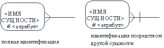 В случае полной идентификации каждый экземпляр данного типа сущности полностью идентифицируется своими собственными ключевыми атрибутами, в противном случае в его идентификации участвуют также атрибуты другой сущности-родителя (рис.7).
