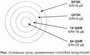 Разные способы модуляции позволяют получить разные скорости передачи при разных отношениях сигнал/шум. Использование КАМ-модуляции обеспечивает более высокую скорость передачи, но требует обеспечения большей величины отношения сигнал/шум. Поэтому такой способ целесообразно применять для пользователей, находящихся вблизи базовой станции. На удалении применяют QPSK и BPSK, позволяющие работать при меньших значениях сигнал/шум. Система автоматически переходит с одного вида модуляции на другой при смене условий передачи (отношения сигнал/шум — S/N). Схематично области применения разных способов модуляции в зависимости от расстояния показаны на рисунке: