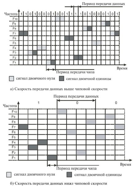 Если частота смены подканалов ниже, чем скорость передачи данных в канале, то такой режим называют медленным расширением спектра (рис. 1.11а); в противном случае мы имеем дело с быстрым расширением спектра (рис. 1.11б).