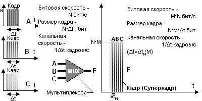 На рисунке: А, В и С — мультиплексируемые каналы с пропускной способностью (шириной) N и длительностью кадра Δt; E — мультиплексированный канал с той же длительносью Δt но с шириной M*N, один кадр которого (суперкадр) несёт в себе все 3 кадра входных мультиплексируемых сигналов последовательно, каждому каналу отводится часть времени суперкадра — таймслот, длиной ΔtM=Δt/M