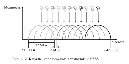 Беспроводные локальные сети DSSS используют каналы шириной 22 МГц, благодаря чему многие WLAN могут работать в одной и той же зоне покрытия. В Северной Америке и большей части Европы, в том числе и в России, каналы шириной 22 МГц позволяют создать в диапазоне 2,4- 2,473 ГГц три неперекрывающихся канала передачи. Эти каналы показаны на рис. 1.12.
