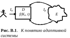 ассмотрим некоторую активную систему D, взаимодействующую с внешней средой E. Предполагается, что эта система имеет априорную информацию о среде Ia, и в процессе функционирования получает текущую информацию Ip как о внешней среде, так и о собственном состоянии (рис. В.1). Целью системы D является принятие решений, связанных с преобразованием или анализом внешней среды E. В общем случае, информация, имеющаяся в распоряжении системы D, является неполной; в этом случае говорят, что система находится в условиях неопределенности. Тогда под адаптацией будем понимать способность активной системы D достигать заданных целей в условиях неопределенности, на основе использования текущей информации Iр о собственном состоянии и состоянии системы E. При этом в системе D могут изменяться ее параметры Ki, структура и алгоритм функционирования.