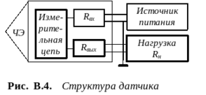 Датчик представляет собой устройство, которое, подвергаясь воздействию физической измеряемой величины, выдает эквивалентный сигнал (обычно электрической природы - заряд, ток, напряжение или импеданс), являющийся однозначной функцией измеряемой величины. В состав простейшего датчика (рис. В.4) входят: один или несколько первичных преобразователей, а также измерительная цепь. Большинство датчиков имеют внешний источник питания, измерительная цепь подключается к нагрузке, в качестве которой может быть использован, например, усилитель, измерительный прибор, блок сопряжения с компьютером и т.п.