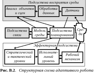 В робототехнике информационные системы используются на трех уровнях управления, которые называются также уровнями адаптации: исполнительном, тактическом и стратегическом. В табл. В.1 приведены примеры задач адаптации, решаемых на каждом из этих уровней и используемые для этого информационные средства.