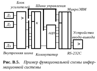 Один, или несколько датчиков в совокупности с усиливающими и преобразующими устройствами образует информационную систему (рис. В.5). Информационная (информационно-сенсорная) система предназначена для выполнения интегральной оценки наблюдаемого процесса или явления, с целью определения его состояния и формирования соответствующего сообщения. В общем случае, она представляет собой совокупность функционально объединенных измерительных, вычислительных и других вспомогательных средств для получения измерительной информации, ее преобразования и обработки с целью предоставления в требуемом виде. На рис. В.5 обозначено: Д1 …ДN - датчики, К - коммутатор, АЦП - аналого-цифровой преобразователь. Сигналы, поступающие с датчиков, после предварительного усиления и преобразования в цифровую форму поступают на микроЭВМ, где выполняется интегральная оценка процесса. Далее формируется сообщение на верхний уровень информационной системы, или в систему управления.