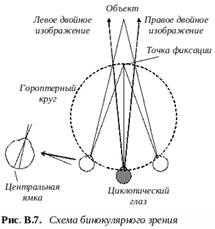 Одно время считалось, что механизмы стереоскопии обусловлены исключительно параллаксом, т.е. разностью углов зрения левого и правого глаза. Однако, хотя действительно расстояние одним глазом оценивается менее точно, чем двумя, утрата этой способности не так существенна, как в случае пространственного слуха. В настоящее время полагают, что восприятие глубины пространства зависит также от ряда дополнительных факторов, в том числе зрительного опыта. Изображение объекта проецируется на сетчатку справа от центральной ямки в левом глазу и слева от нее в правом. Это позволяет при бинокулярном зрении создать неперекрещивающиеся двойные изображения. Их наложение осуществляется в так называемом циклопическом глазе, воображаемом органе, в который проецируются сетчатки правого и левого глаза (рис. В.7). Установлено, что изображение не будет двоиться, если объект находится в области гороптера.- криволинейной поверхности, на которой лежат узловые точки обоих глаз и точка фиксации. Бинокулярное зрение у людей не является врожденным и формируется в результате опыта в возрасте 8 … 27 недель