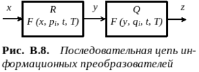 В качестве примера рассмотрим информационную систему (рис. В8) в которой происходит последовательное преобразование информации. Для простоты ограничимся двумя преобразователями R и Q. При анализе этой модели воспользуемся известным подходом К. Шеннона и Д. фон Неймана, определяющим информацию I как меру случайного выбора. Согласно этому подходу, в альтернативной ситуации любое событие оценивается не содержанием, а вероятностью или «редкостью» его наступления. В результате при осуществлении выбора информации оказывается тем больше, чем меньше ожидается совершившееся событие. Тогда, при числе возможных вариантов событий n количество информации I, получаемой в ходе реализации выбора пропорционально ln n: