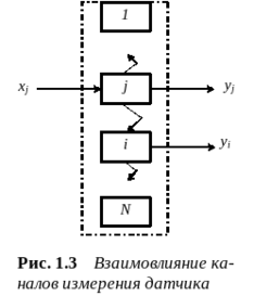 Вообще говоря, любой датчик можно считать многокомпонентным, поскольку на него кроме измеряемой величины действуют влияющие факторы, обусловленные внешними причинами. Тем не менее, мы под многокомпонентным датчиком будем понимать такой преобразователь, который конструктивно предназначен для измерения нескольких параметров. Особенностью многокомпонентного датчика является взаимное влияние каналов измерений (рис. 1.3) Для оценки этого свойства измерителя используется понятие избирательности каналов.