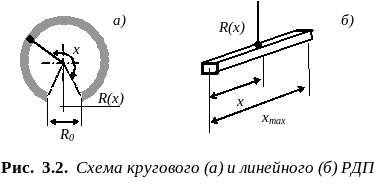 Конструктивно РДП выполнен в виде потенциометра с подвижным движком. В большинстве случаев движок механически связан с потенциометром и представляет собой скользящий контакт. В некоторых моделях контакт заменен оптической или магнитной связью. На рис. 3.2 представлены схемы кругового и линейного РДП.