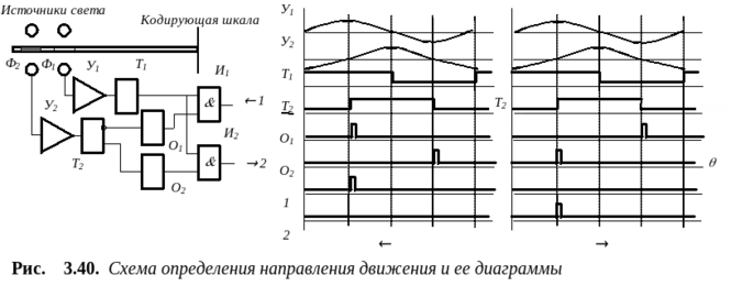 Для определения направление вращения вала (штока) используются шкалы, относительное смещение штрихов на дорожках которых составляет четверть шага. В этом случае, выходной сигнал с одновибратора внешней дорожки будет опережать сигнал одновибратора внутренней для одного направления движения и отставать для другого. Для определения числа целых оборотов используется репер, формирующий импульс начала отсчета. Он также используется для возврата счетчика в 0.