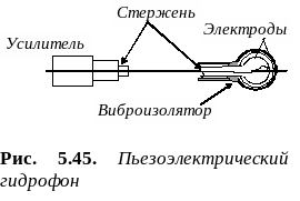 астотные свойства ПЭАП зависят от условий эксплуатации - в некоторых случаях их делают резонансными, в других - широкополосными. Исходя из этого, выбирают и размеры ПЭАП. Так, например, размер подводного УЗ приемника - гидрофона рассчитывается из условия, чтобы его резонансная частота была несколько выше рабочего диапазона частот. Это позволяет гидрофон диаметром несколько миллиметров использовать для приема без искажений сигналов в диапазоне частот 102 … 106 (рис. 5.44).