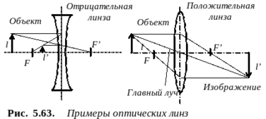 сновой ОЛС является совокупность оптических деталей (линз, зеркал, призм и т.д.) образующих изображение предметов на фотоприемнике, получившая название оптической системы. В оптической системе принято различать пространство предметов - область, в которой расположены объекты, и пространство изображений - область, в которой размещается изображение. Важнейшим элементом оптической системы является линза (рис. 5.63). В зависимости от комбинации образующих линзу поверхностей (выпуклой, вогнутой и плоской) различают более 10 типов линз. Наиболее распространенные типы линз имеют сферические сопрягаемые поверхности. В отдельных случаях для луп, конденсоров, светофильтров и т.д. используют линзы Френеля, обладающих ступенчатой поверхностью. (Минимальный размер ступенек составляет 0,01 мм). Линзы Френеля выполняют методом прессования из пластмасс, что существенно снижает их стоимость.