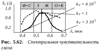 Световое излучение рассматривается в двух разделах физики: радио- и фотометрии. В первом случае, для его оценки применяются энергетические характеристики, во втором - визуальные. Визуальные параметры служат для описания световых процессов протекающих в диапазоне видимых волн и воспринимаемых глазом. Энергетические же используются, как правило, для тех излучений, которые лежат за пределами видимого спектра. Такое разделение вызвано тем, что действие видимого света на глаз зависит не только от физических параметров света - энергии излучения, частоты, спектрального состава, но и спектральной чувствительности Sc() глаза (рис. 5.62). Сплошной линией показана кривая средней спектральной чувствительности глаза, пунктир - спектр солнечного света. Максимум Sc() достигается для = 5,0 10-7 м … 5,55 10-7 м (первое значение справедливо для черно-белого, так называемого скотопического зрения, второе - для цветного, или фотопического зрения).