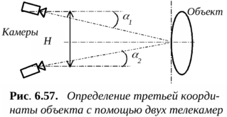 СТЗ под трехмерным понимают изображение, содержащее информацию о трех геометрических измерениях объекта. Оно может быть получено с помощью двух телекамер (3D), или могут использоваться специальные приемы. (В этом случае, обычно говорят о 2,5D или K2D изображениях). При использовании 2-х телекамер, каждая из них обрабатывает свой плоский 2D образ, на основании описанных выше принципов. Если известна ориентация каждой камеры и расстояние между ними, всегда можно восстановить третью координату объекта (рис. 6.59). Основная трудность этого метода заключается в идентификации каждой точки объекта по их плоским изображениям на двух камерах, особенно в случае нечетких изображений. Обычно две телекамеры используются в задачах телеуправления, в мобильных роботах и др. (Примерами таких роботов являются отечественные разработки МРБ-25, МГТУ им. Н.Э. Баумана и «Богомол», ИФТП). При необходимости, результирующее 3D изображение может быть выведено на обычный монитор, что применяется, например, в задачах телеуправления. С этой целью, в одно поле вводится информация с одной камеры, а в другое - с другой. Другими словами, нечетный полукадр развертки образует видеосигнал, например, с левой телекамеры, а четный - с правой. Ясно, что такое изображение субъективно воспринимается как двоящееся. Поэтому, для получения бинокулярного эффекта необходимо использовать стереоочки.
