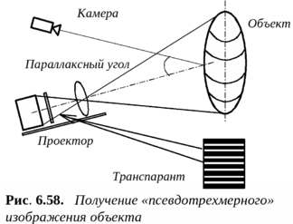 ругой распространенный способ получения «псевдотрехмерных» изображений, требует только одного телевизионного датчика и связан с применением «структурированной подсветки» (рис. 6.61). В частности, он используется в лазерных 3D-сканерах. Объект освещается от проектора через матрицу - транспарант с периодической системой полос, а изображение воспринимается камерой, расположенной под некоторым параллаксным углом к оси проектора. Зная расстояние (период) между полосами, а также взаимное положение камеры и проектора, можно восстановить форму объекта. Полученное изображение объекта в виде бинарных искривленных линий можно интерпретировать как результат фазовой пространственной модуляции оптического сигнала. Действительно, если периодическую сетку, спроецированную на плоский экран считать несущим сигналом, то любая неплоская поверхность вносит фазовую модуляцию в этот сигнал, причем закон модуляции линейно связан с профилем поверхности в направлении оптической оси камеры. Данный способ также позволяет восстановить третью координату объекта. Рис. 6.60а и б иллюстрируют принцип восстановления рельефа объекта и наблюдаемая на экране его трехмерная модель. Обозначив Tx - период полос транспаранта вдоль оси Х, - паралаксный угол, определим период полос, воспринимаемых камерой: Txk = Tx/tg. Следовательно, для любой точки на изображении с координатами xk, yk, принадлежащей i-ой линии транспаранта можно восстановить третью координату zk: