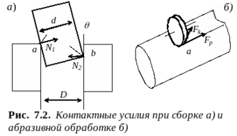 Для операций типа абразивной обработки (рис. 7.2б) контакт подразумевается одноточечным. Под Fк и Fр обозначены радиальная сила и сила резания.